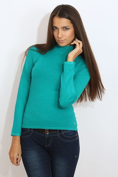 Симпатичная водолазка изумрудного цвета с высоким воротником и длинными рукавами.
