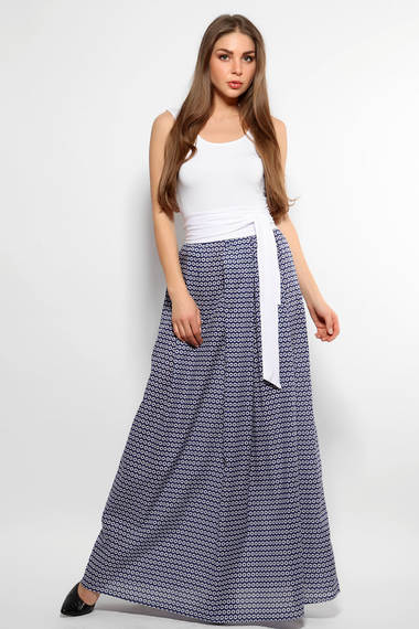 ОписаниеДлинное платье выполнено из двух видов ткани: хлопковая юбка синего цвета и верх виде белой майки из хлопкового трикотажа. В комплекте длинный пояс.