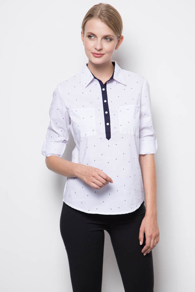 Интересная белая блуза мелкий горошек, модель с застежкой поло и классическим воротником, длину рукавов можно регулировать.
