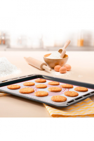 ОписаниеСиликоновый коврик для выпечки, выдерживает температуру от -40°C до +230°C. Подходит для выпечки и заморозки. Легко моется, не впитывает запахи и компактно складывается. На изделие нанесена специальная разметка в виде окружностей различных диаметров (от 10 до 22,5 см), таблица мер и весов, а также линейка с дюймами и сантиметрами по краям. С силиконовым ковриком выпечка не будет прилипать и подгорать. Размер: 40х30 см.